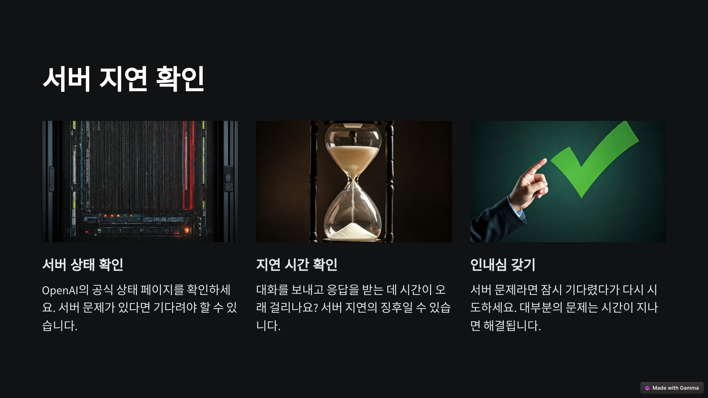 챗GPT는 클라우드 기반이기 때문에 OpenAI 서버의 일시적 지연으로 문제가 발생할 수 있습니다.