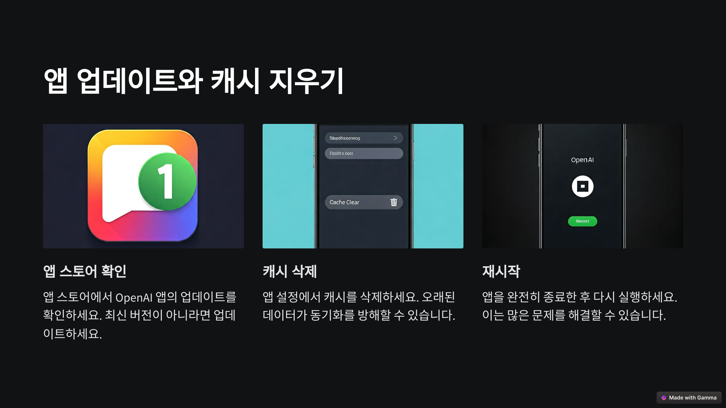 - OpenAI 앱을 최신 버전으로 업데이트하세요. 업데이트를 통해 동기화와 관련된 오류가 해결될 수 있습니다.