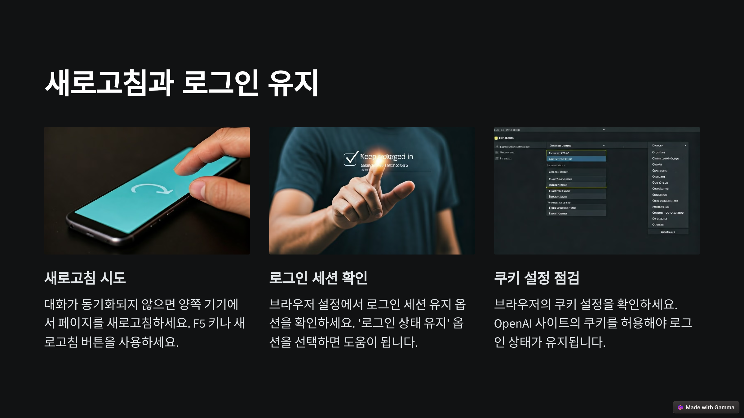 노트북과 휴대폰에서 챗GPT를 동기화하는 것은 동일한 계정 사용, 네트워크 최적화, 앱과 브라우저의 일관된 사용 등 몇 가지 간단한 설정을 통해 해결할 수 있습니다. 위의 방법들을 따라하면 대부분의 동기화 문제가 해결될 것입니다.