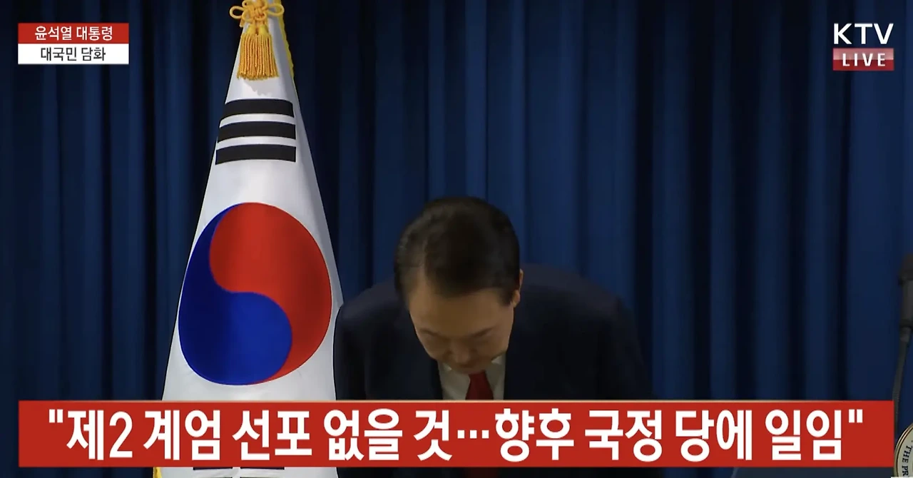12월 7일 오전 10시, 윤석열 대통령은 대국민 담화를 통해 비상계엄 선포로 국민들에게 불안과 불편을 끼친 점에 대해 진심으로 사과했습니다. 대통령은 "국정 최종 책임자로서 절박함에서 비롯된 결정이었지만, 국민들께 많은 걱정을 끼쳐드렸다"고 언급하며 고개를 숙였습니다.