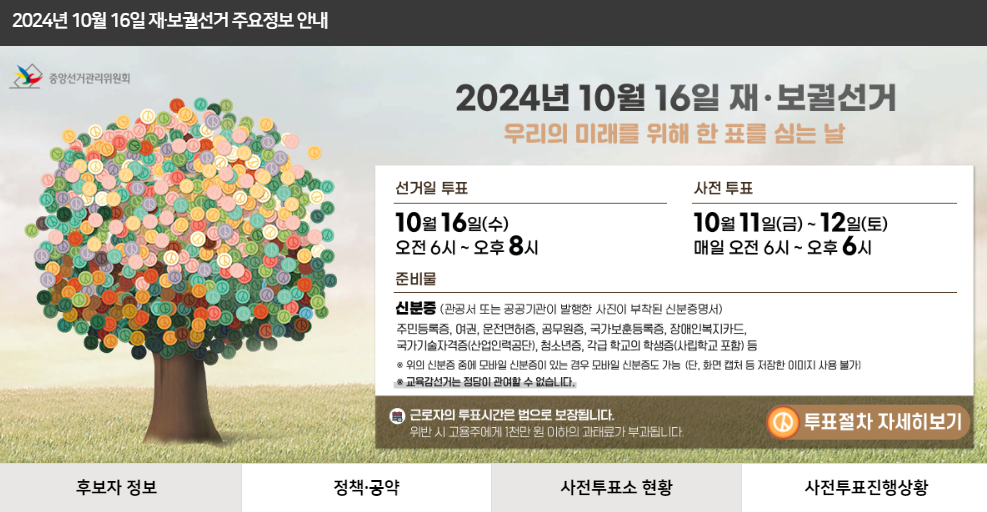 - 사전투표 일정: 2024년 10월 11일(금) ~ 10월 12일(토)