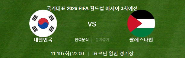 이번 팔레스타인전은 한국의 어웨이 경기로, 팔레스타인이 아닌 요르단의 암만에서 열립니다. 경기는 한국 시간으로 11월 19일 화요일 밤 11시에 시작됩니다. 대표팀이 해외에서 체력 관리와 좋은 컨디션을 유지하는 것이 관건이 될 것으로 보입니다.