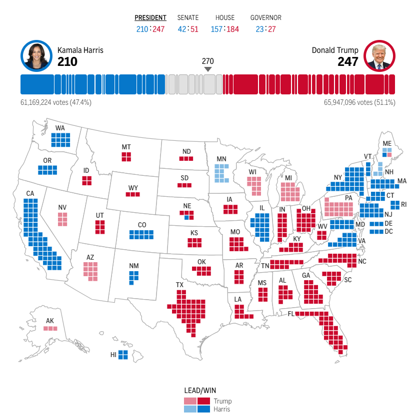현재까지의 개표 상황과 주요 경합 주의 동향을 보면, 각 주의 경합이 치열하게 이어지고 있습니다. 특히 미시간, 펜실베이니아, 조지아와 같은 주에서의 승리 여부가 최종 결과에 중요한 변수가 될 것입니다.